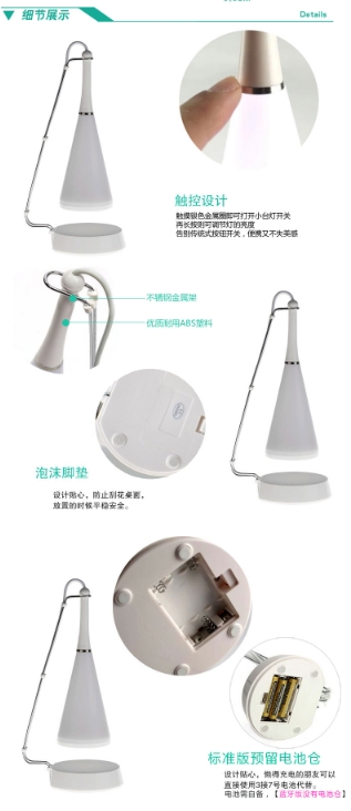 此外,手机无线充电台灯还有一个蓝牙音响功能,连接手机蓝牙就可以播放音乐了,喜欢的音乐随意听,10米的蓝牙连接距离,4.0的蓝牙版,传输更快更无损。无线充台灯的底座中间的一圈透明设计,当连接蓝牙播放音乐时,那透明圈会出现蓝色灯光,蓝色灯光会随着音乐节奏的变化而变化,整个台灯仿佛会呼吸了一样,使整体看上去更加活泼灵动。