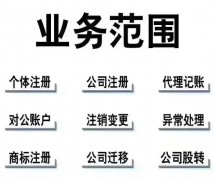 服务范围:1、注册公司:专业代办公司注册,提供注册地址,提供公司注册所需的材料,提供公司章、法人章、财务章等,,价格实惠,性价比高!无论内资注册,外资公司注册,还是注册分公司、大额注册、企业注册、注册营业执照等均可办理!2、公